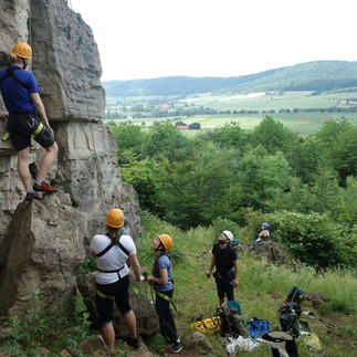 Bei über 30 Grad und strahlendem Sonnenschein kam die Gruppe am Freitagabend im Naturfreundehaus in Salzhemmendorf an und bereitete sich vor Ort auf die nächsten zwei Tage vor. Nach einem leckeren Frühstück am Samstagfrüh starteten wir voller Vorfreude zur Felswand „Brunkenser Klippen“. Dort angekommen, stiegen alle in ihre Kletterausrüstung und machten sich nach einem Sicherheitscheck in kleinen Teams daran, verschiedene Kletterrouten am Felsen im Wechsel zu erklimmen. Während der Kletteraktivitäten wurden neue Felsen entdeckt, die persönlichen Grenzen ausgetestet, die eigenen Fähigkeiten erkannt und gestärkt, verschiedene Sicherungstechniken erlernt und gefestigt und sich untereinander vielfach ausgetauscht.